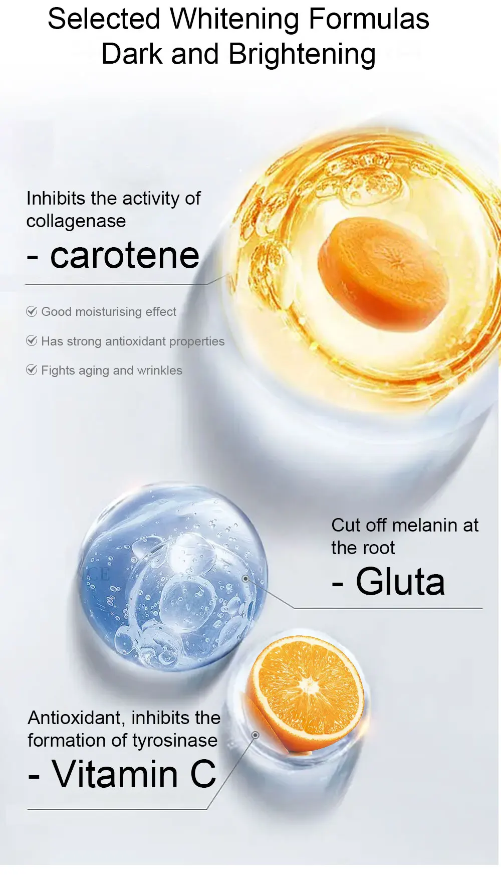 Carrot Oil, Collagen, Glutathione, Vitamins C & E,
