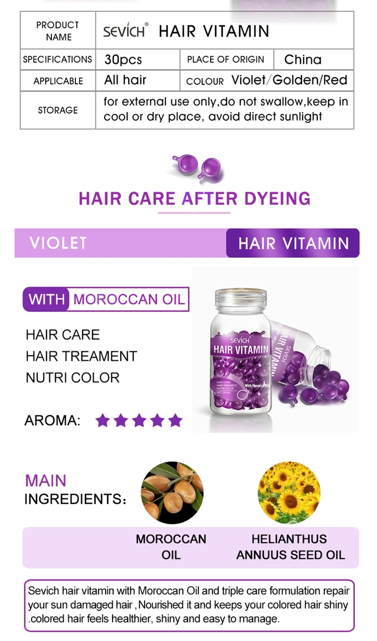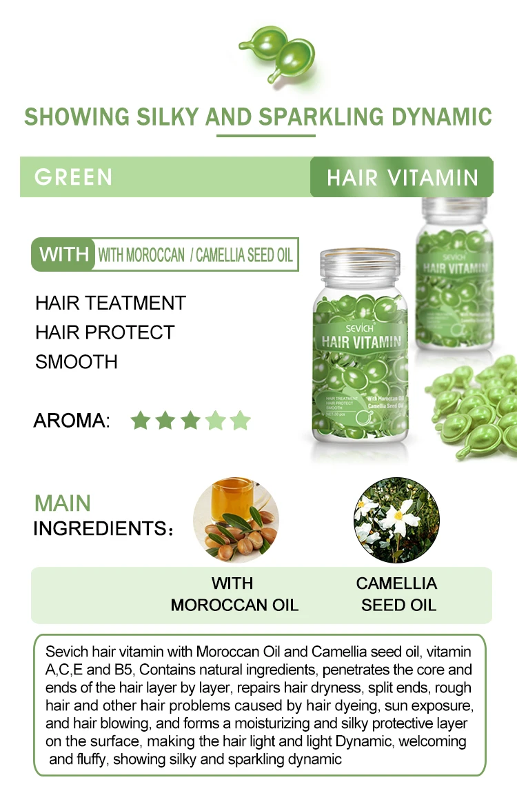 Sevich hair vitamin with MOROCCAN hair care oils and Camellia seed oil, vitamin A, C, E and B5, Contains natural ingredients, penetrates the core and ends of the hair layer by layer, repairs hair dryness, split ends, rough hair and other hair problems caused by hair dyeing, sun exposure, and hair blowing, and forms a moisturizing and silky protective layer on the surface, making the hair light and light Dynamic, welcoming and fluffy, showing silky and sparkling dynamic.