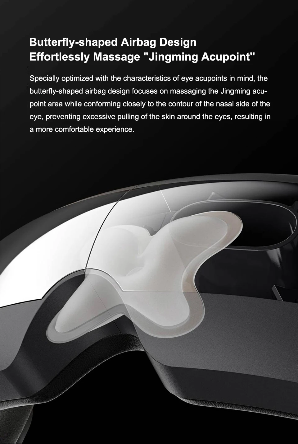 Specially optimized with the characteristics of eye acupoints in mind, the butterfly-shaped airbag design focuses on massaging the Jingming acupoint area while conforming closely to the contour of the nasal side of the eye, preventing excessive pulling of the skin around the eyes, resulting in a more comfortable experience.