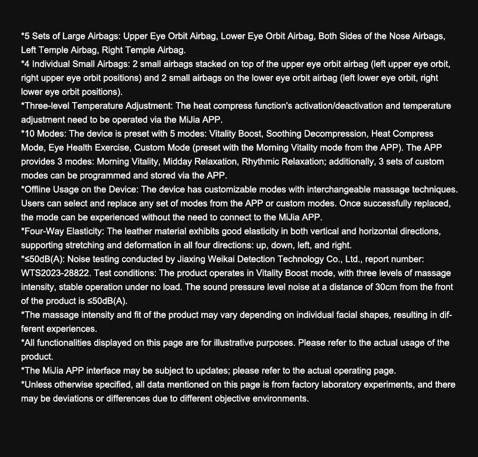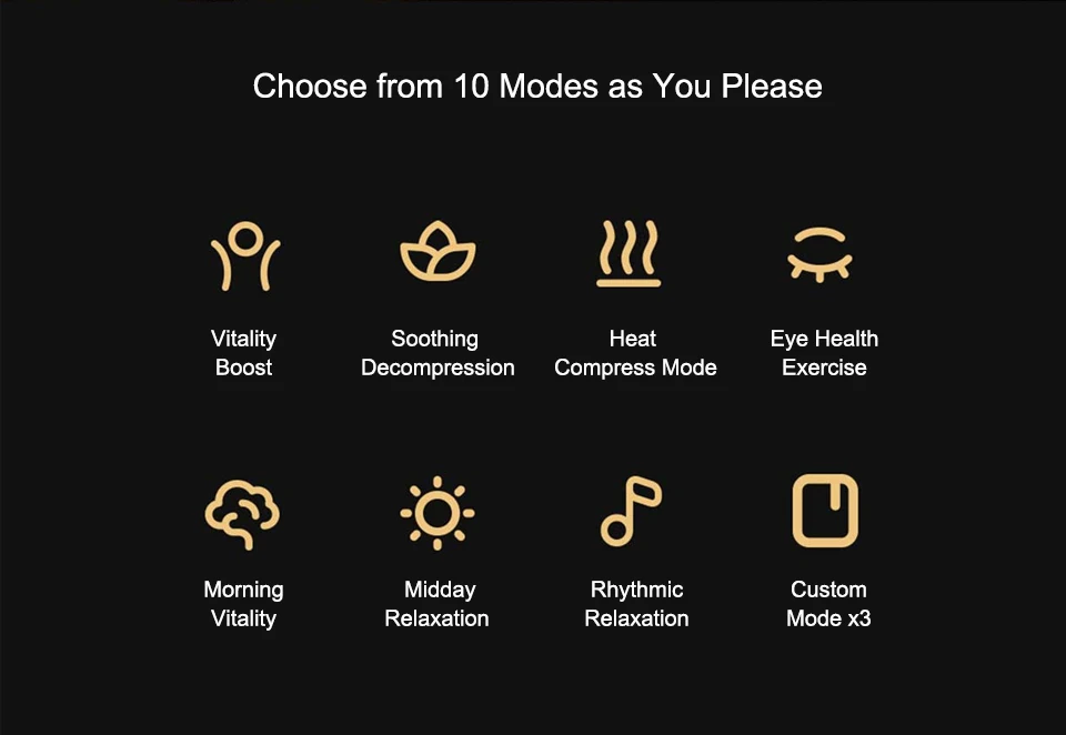 *10 Modes: The device is preset with 5 modes: Vitality Boost, Soothing Decompression, Heat Compress Mode, Eye Health Exercise, Custom Mode (preset with the Morning Vitality mode from the APP). The APP provides 3 modes: Morning Vitality, Midday Relaxation, Rhythmic Relaxation; additionally, 3 sets of custom modes can be programmed and stored via the APP.