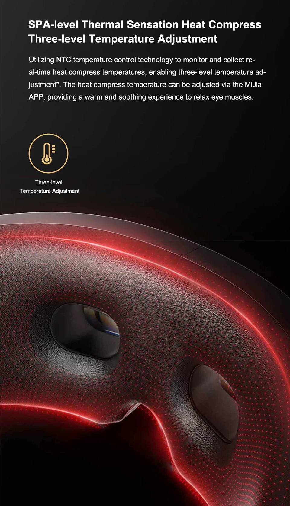 Utilizing NTC temperature control technology to monitor and collect real-time heat compress temperatures, enabling three-level temperature adjustment*. The heat compress temperature can be adjusted via the MiJia APP, providing a warm and soothing experience to relax eye muscles.